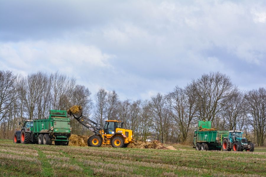 Wir streuen Ihren Dung mit zwei großvolumigen Dungstreuern exakt und genau pro ha auf Ihre landwirtschaftlichen Flächen. Das Aufladen erledigen wir mit einem Radlader, der mit Breitreifen und Stollenprofil ausgestattet ist.